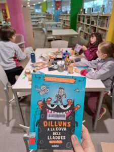 Al club de lectura benjamí de febrer hem comentat el llibre Dilluns a la cova dels lladres, el primer títol de la col·lecció Caos total. És una història de Ralph Lazar plena d’imaginació, aventures i invents, en la qual en Dash, el protagonista, ha d’enfrontar-se a un munt de situacions de caos total per descobrir qui ha robat el trofeu de belluga-bola i el flascó del perfum més car del món.
